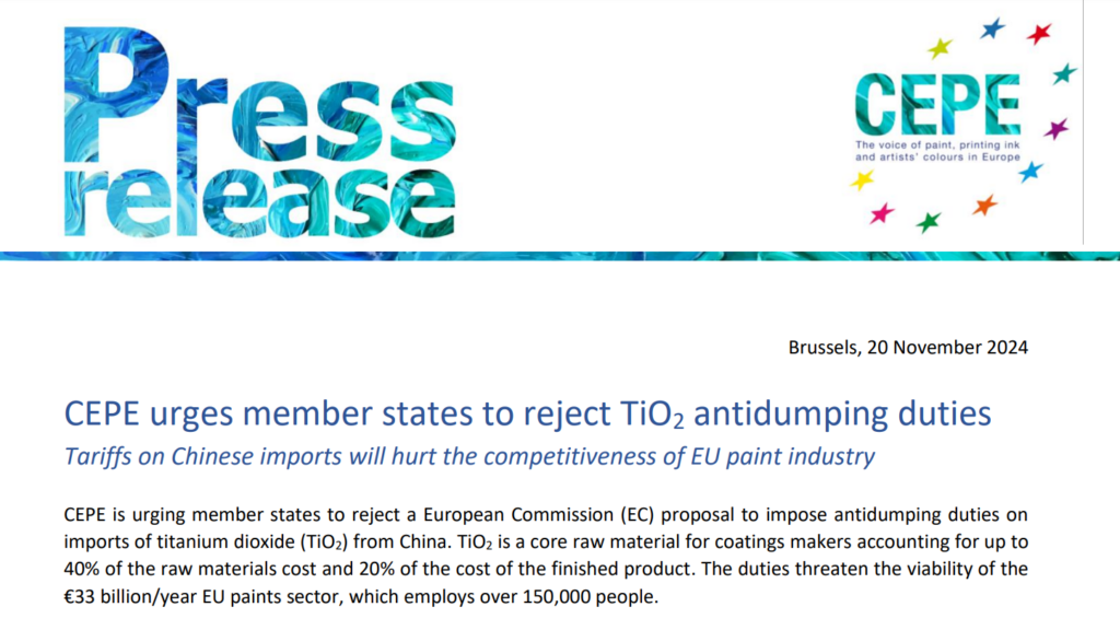 CEPE insta a los Estados miembros a rechazar las tasas antidumping sobre el TiO2.